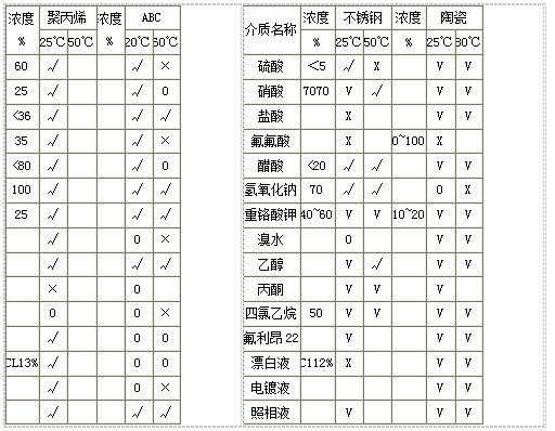 符號(hào)說(shuō)明:V -優(yōu)良. V -良好,0-可用.但腐蝕明顯X -腐蝕嚴(yán)重,不適用。
