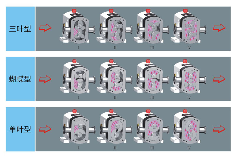轉(zhuǎn)子泵又稱羅茨泵、膠體泵、高濃漿泵等,它依靠兩個同步運動的轉(zhuǎn)子,由一對外置式同步齒輪箱進行傳動,轉(zhuǎn)子在傳動軸的帶動下進行同步反方向旋轉(zhuǎn),從而構成了較高的真空度和排放壓力。兩轉(zhuǎn)子將轉(zhuǎn)子室分隔成幾個小空間,并按I-II-III-IV的次序運轉(zhuǎn)。運轉(zhuǎn)到I位置時,只有處充滿介質(zhì);運轉(zhuǎn)到II位置時,II室中封閉了部分介質(zhì);到位置時,III室中也封閉了介質(zhì);到位置IV時,處和出口室相通,介質(zhì)即被輸送至出物料管道。按這樣的循環(huán)往復,介質(zhì)即被不斷的輸送出去。